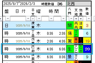 2025年9月18日の時盤卯刻 生門で天地は乙乙 効果「乙♡」 数値は20を使った。