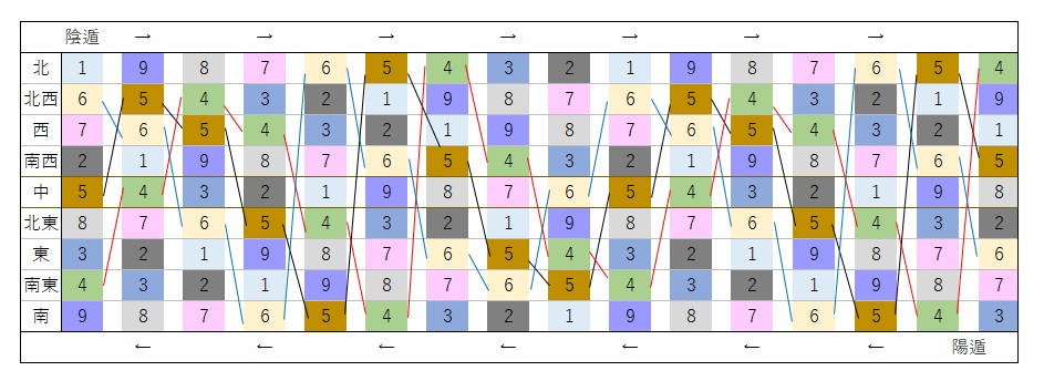 この図から北なら規則正しく時と共に隠遁なら1→9→8→7→6と変化していくのがわかります。