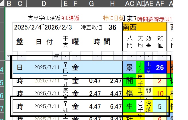 奇門遁甲カレンダー 7月11日の南西日盤と時盤