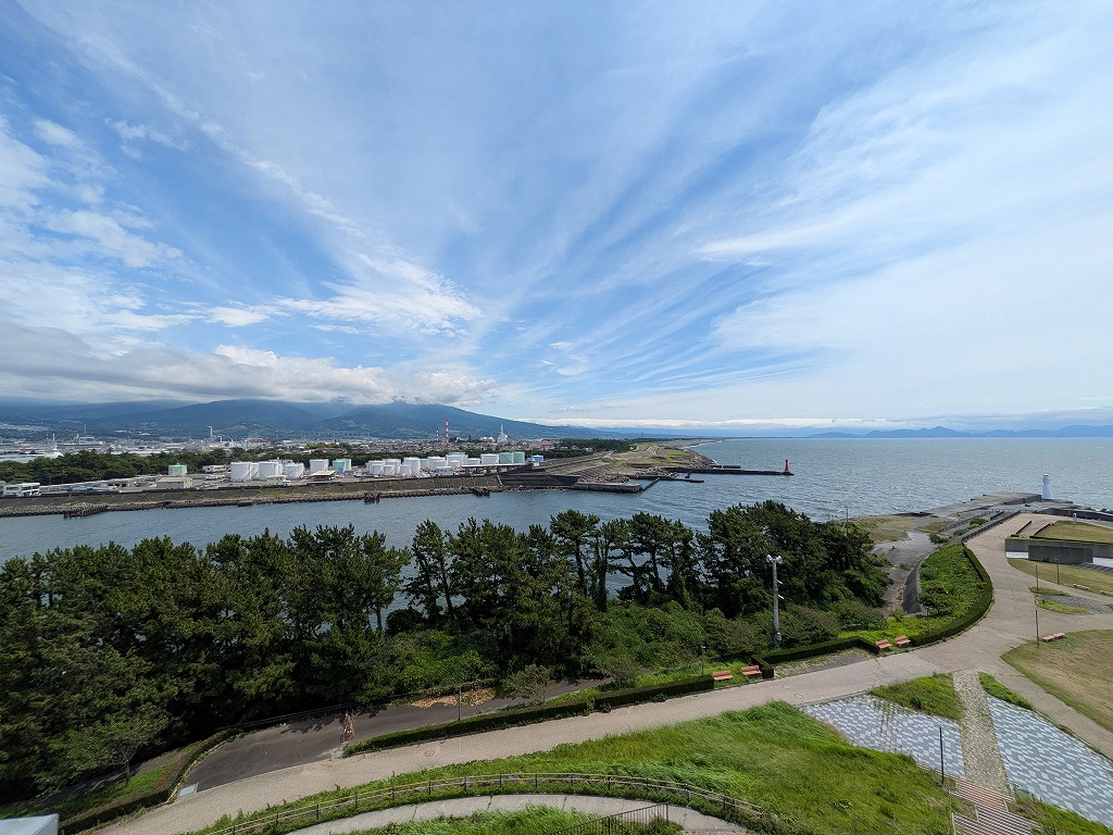 田子の浦みなと公園の展望台から富士山だけがすっぽりと雲の中だが にくい青空が輝き始める。