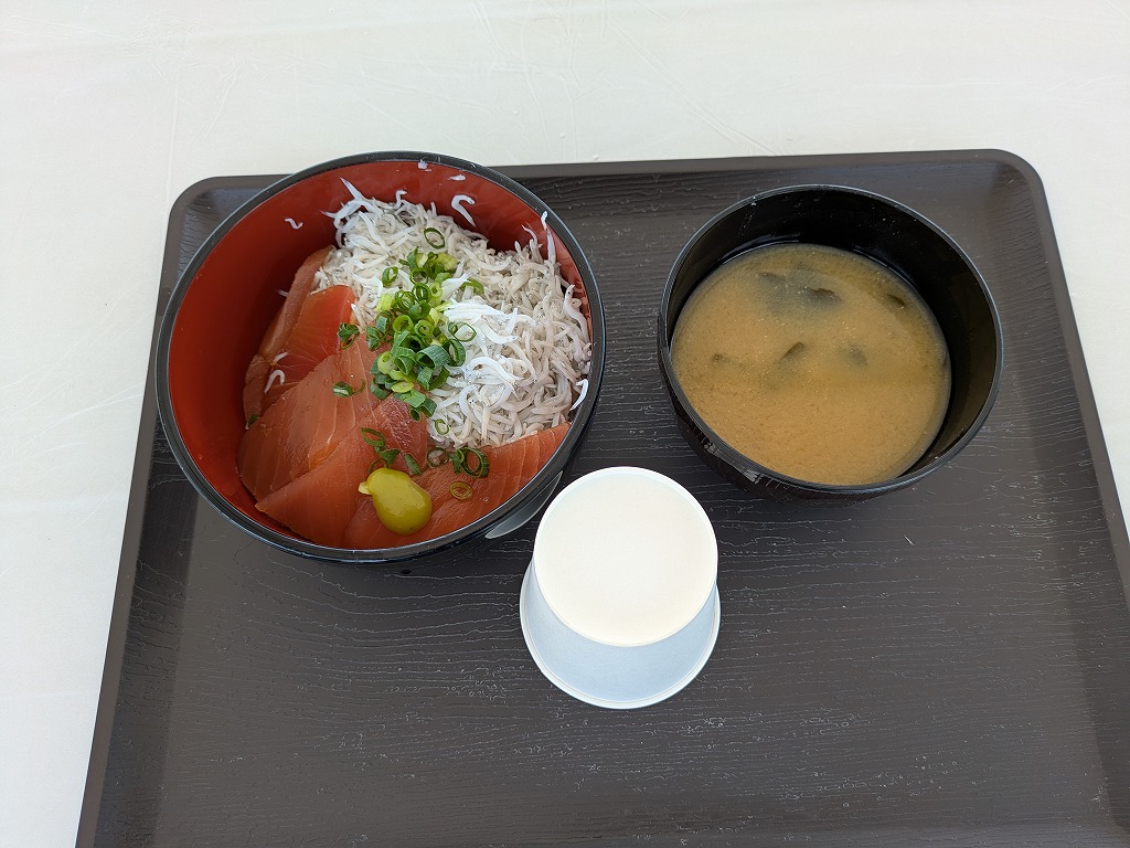 屋外テントの中で食べる マグロとシラス合体どんぶり 1,000円なり