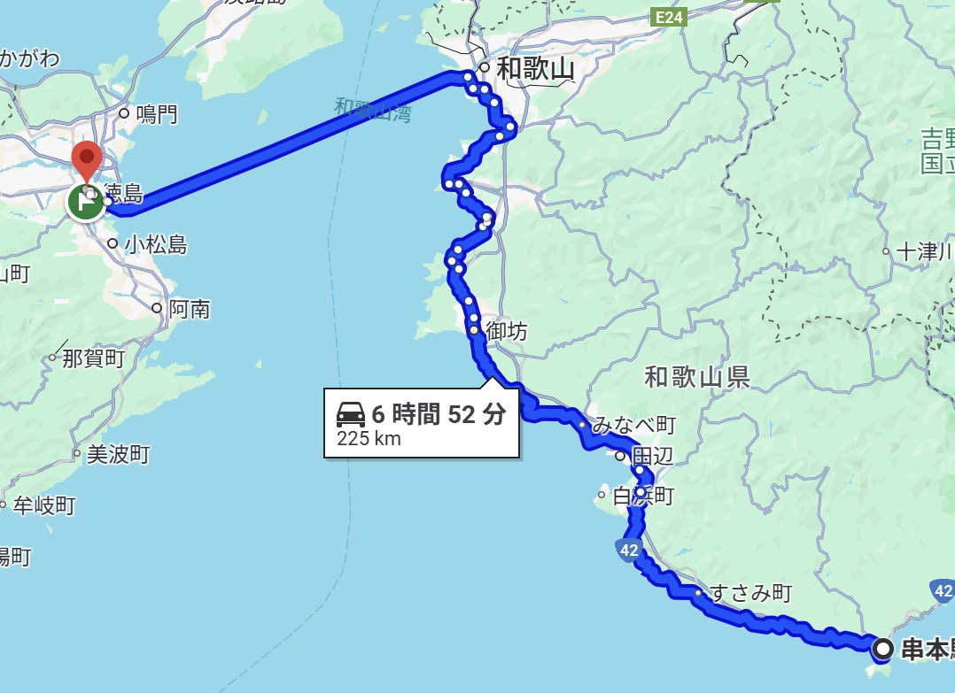 グーグルマップでは串本から和歌山まで4時間と出たが、おれのカブ号と俺では休憩を入れると5時間以上はかかりそうだ。