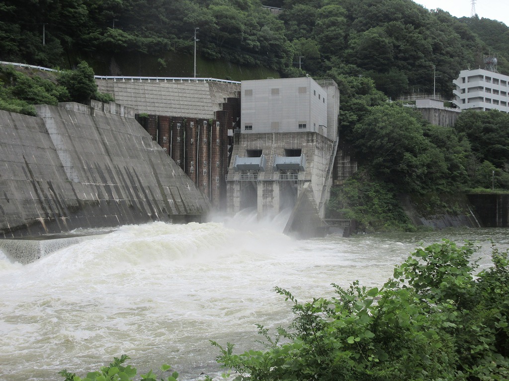 途中のダム湖放水、大量の雨で四国の川は荒れ狂っている。