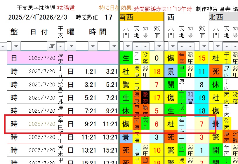 先に、今日の時盤(南西では傷門-6 西なら杜門-7 キズ門と隠れ門)