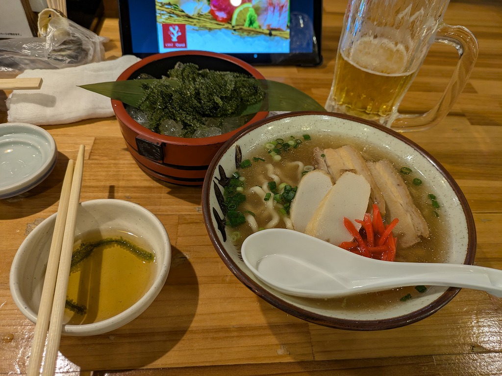 海ブドウはめちゃ好き! 沖縄そば ビール・・・泡盛のお湯割りも 焼きガキも食べてしまって・・