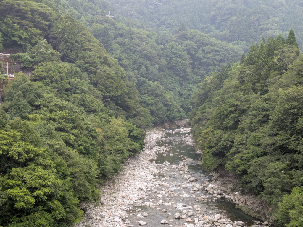 国道158号線の曲がりくねった急こう配で急角度の道で見た渓谷