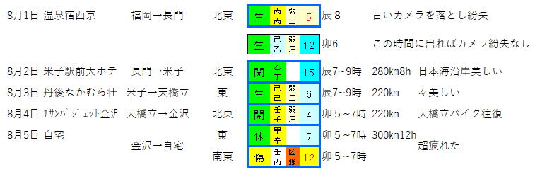 日付け 宿泊地 ルート 方位 時盤の状態 時間 距離や出来事などエクセルより抽出