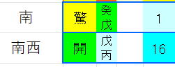 八門は驚門(ビックリ門)で天地は乙(人間関係に吉)丙(ビジネスに吉)効果は弱圧(小さいトラブルあり)数値は+4の弱吉